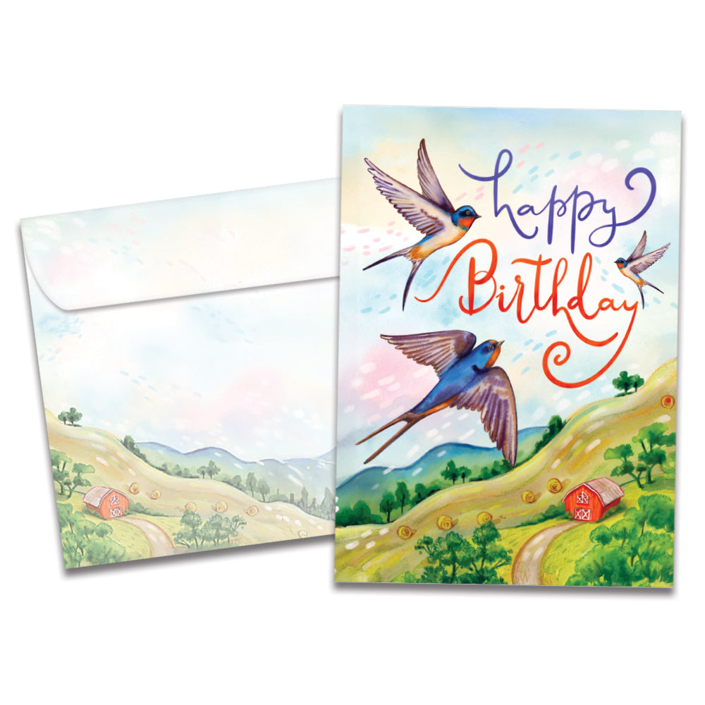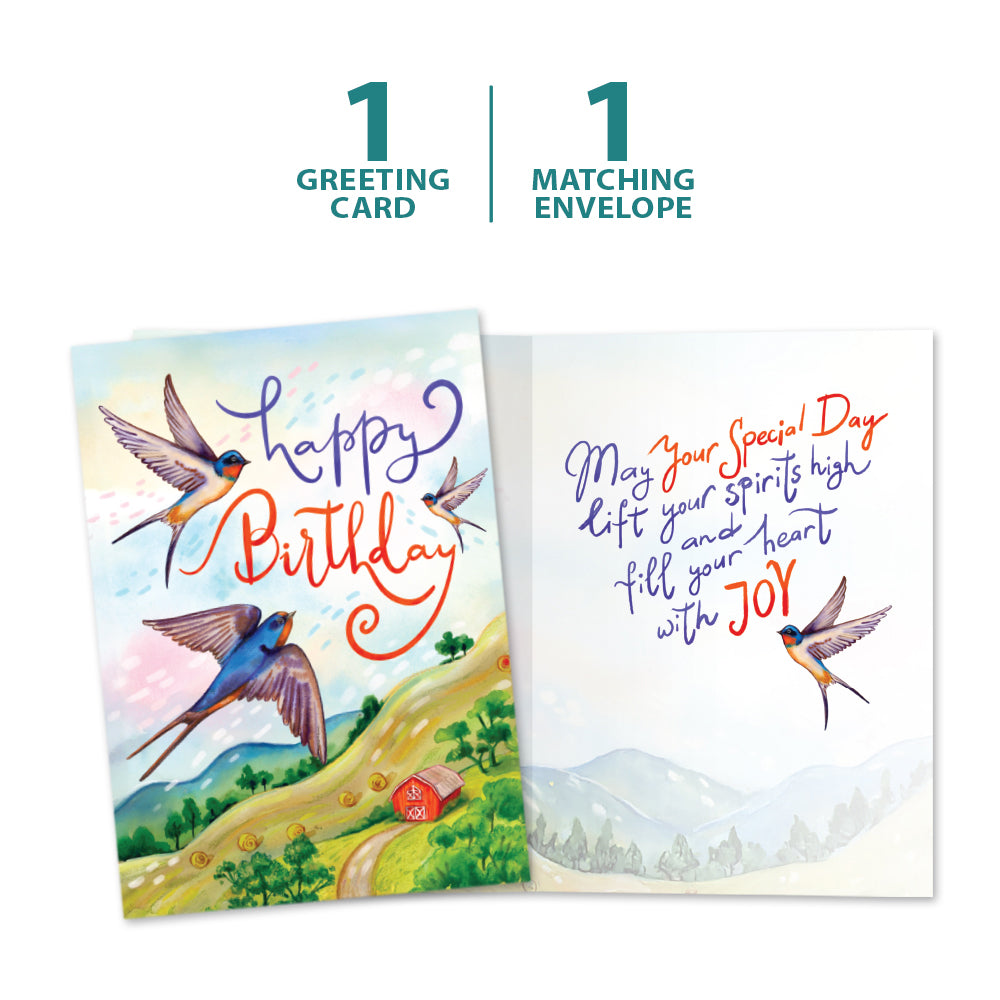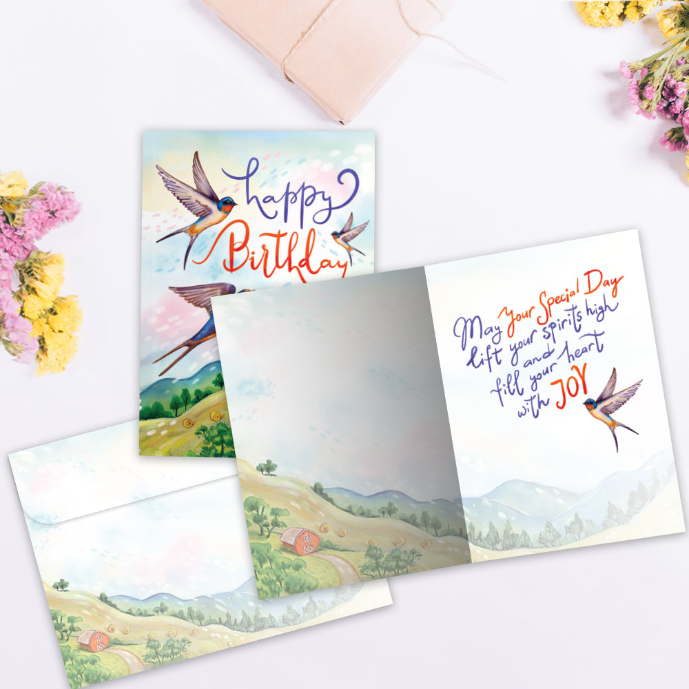 This Birthday card set shares the message "Happy birthday" on the cover, and on the inside reads "May your special day lift your spirits high and fill your heart with joy". It features art by Olga Akbarova and includes one 5 x 7 greeting card with a matching ARTvelope (all our 5 x 7 envelopes are designed to match the greeting card cover art). Printing powered by solar energy. 100% Post-consumer recycled. Proudly Made in the USA