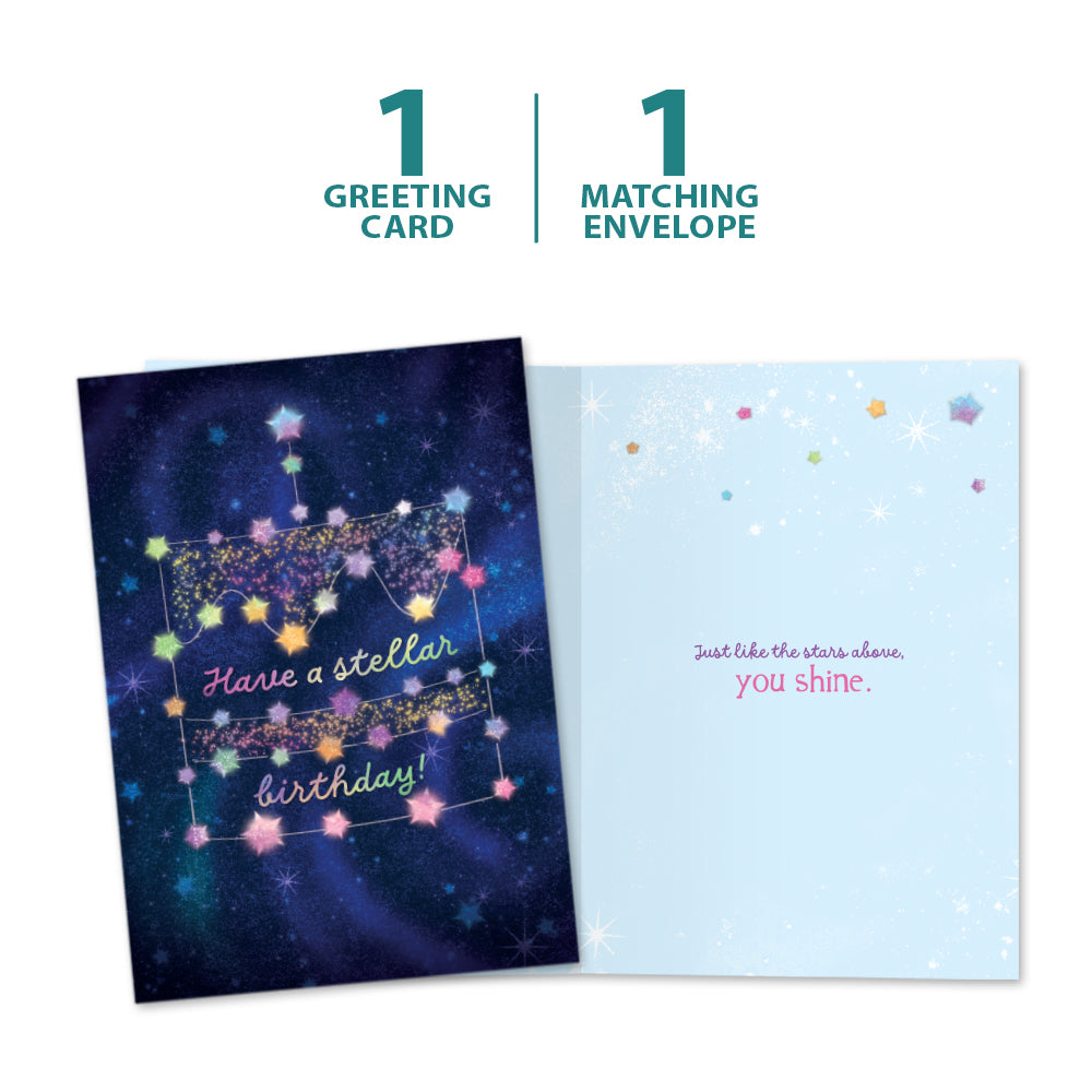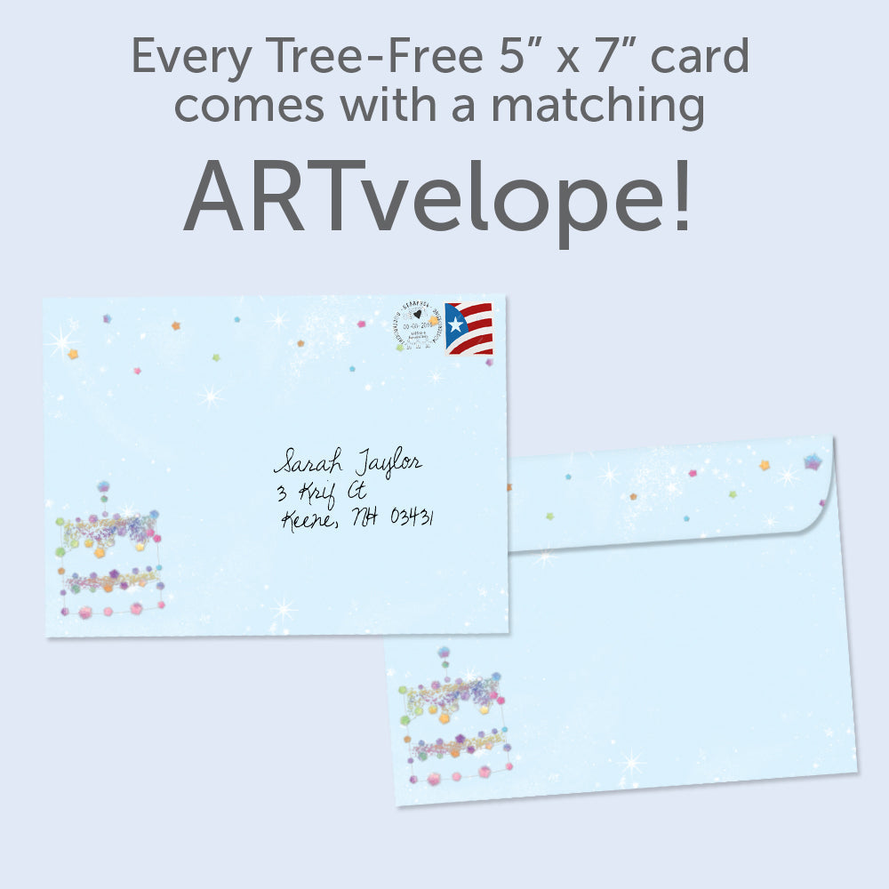This Birthday card set shares the message "Have a stellar birthday!" on the cover, and on the inside reads "Just like the stars above, you shine". It features art by Tracey Coon and includes one 5 x 7 greeting card with a matching ARTvelope (all our 5 x 7 envelopes are designed to match the greeting card cover art). Printing powered by solar energy. 100% Post-consumer recycled. Proudly Made in the USA