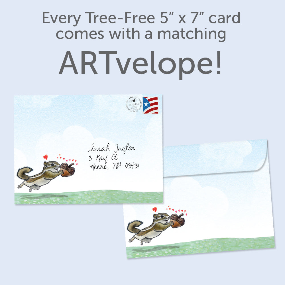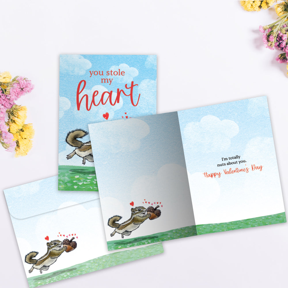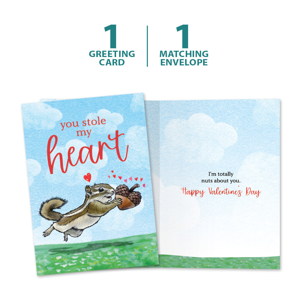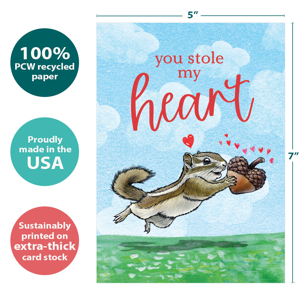 This Valentine's Day card set shares the message "You stole my heart" on the cover, and on the inside reads "I'm totally nuts about you. Happy Valentine's Day". It features art by Shawn Braley and includes one 5 x 7 greeting card with a matching ARTvelope (all our 5 x 7 envelopes are designed to match the greeting card cover art). Printing powered by solar energy. 100% Post-consumer recycled. Proudly Made in the USA