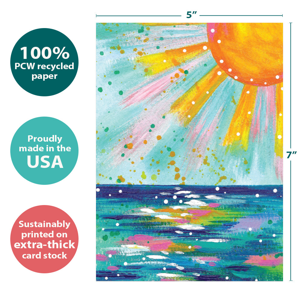 This Just Because card set is blank on the cover, and on the inside reads "Sending you sunshine". It features art by Bethany Joy and includes six 5 x 7 greeting cards with matching ARTvelopes (all our 5 x 7 envelopes are designed to match the greeting card cover art). Printing powered by solar energy. 100% Post-consumer recycled. Proudly Made in the USA
