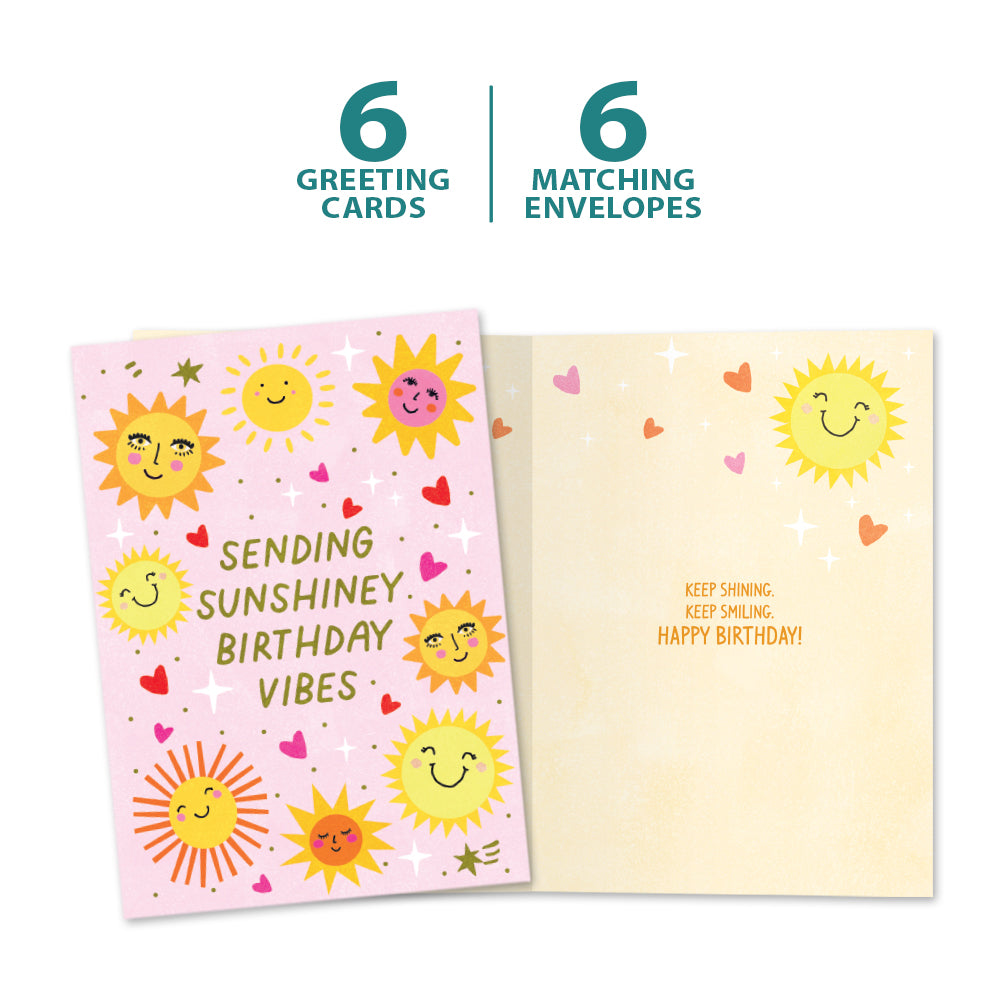 This Birthday card set shares the message "Sending sunshiney birthday vibes" on the cover, and on the inside reads "Keep shining. Keep smiling. Happy birthday!". It features art by Hammond Gower Publications and includes six 5 x 7 greeting cards with matching ARTvelopes (all our 5 x 7 envelopes are designed to match the greeting card cover art). Printing powered by solar energy. 100% Post-consumer recycled. Proudly Made in the USA