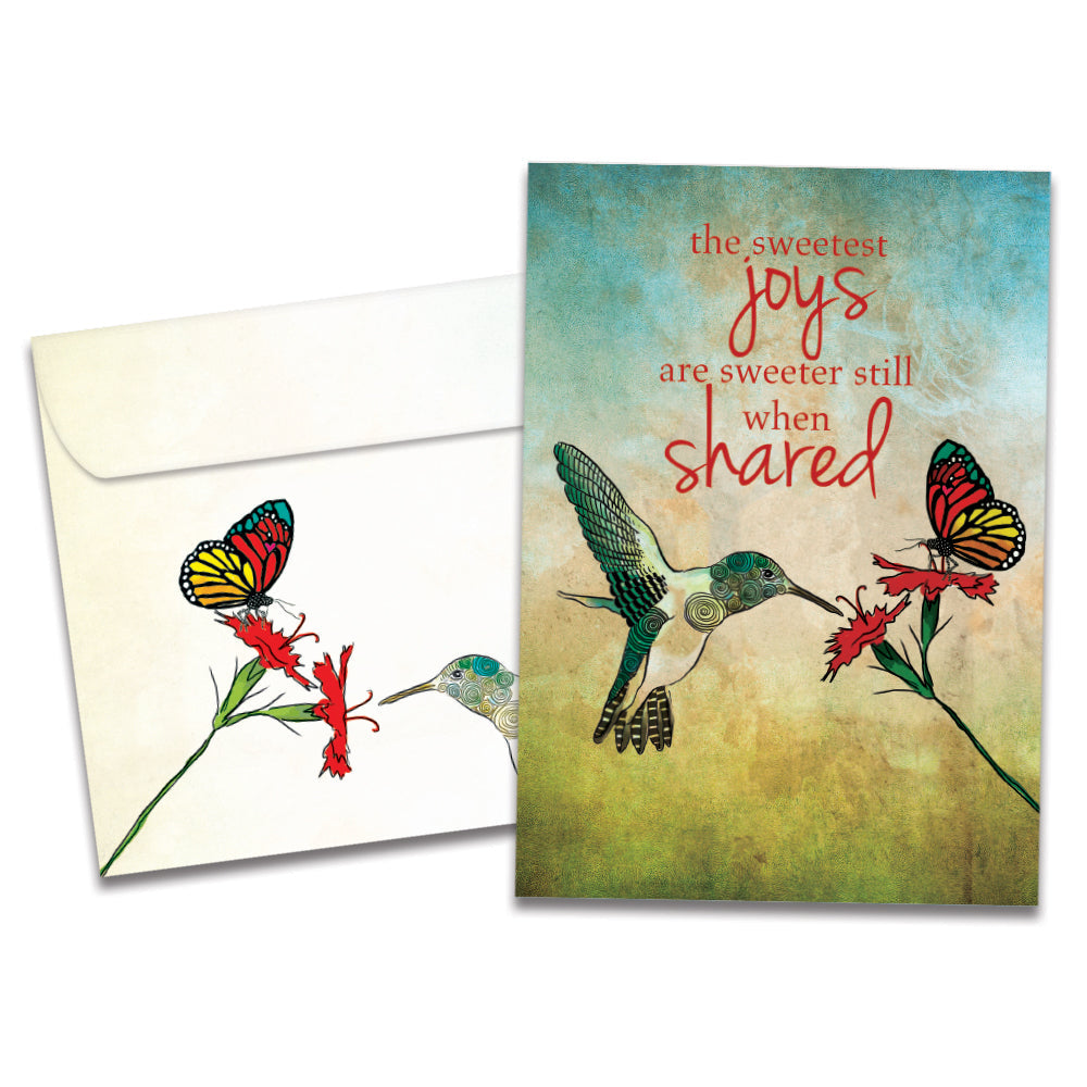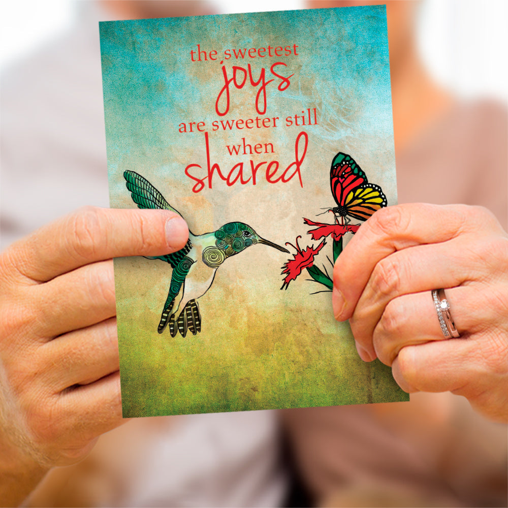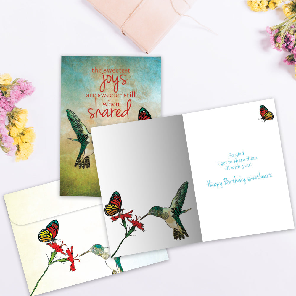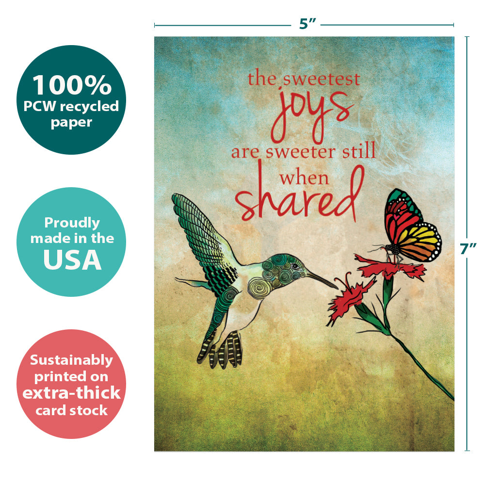 This Birthday card set shares the message "The sweetest joys are sweeter still when shared" on the cover, and on the inside reads "So glad I get to share them all with you! Happy birthday, sweetheart". It features art by Suzanne Millius and includes one 5 x 7 greeting card with a matching ARTvelope (all our 5 x 7 envelopes are designed to match the greeting card cover art). Printing powered by solar energy. 100% Post-consumer recycled. Proudly Made in the USA