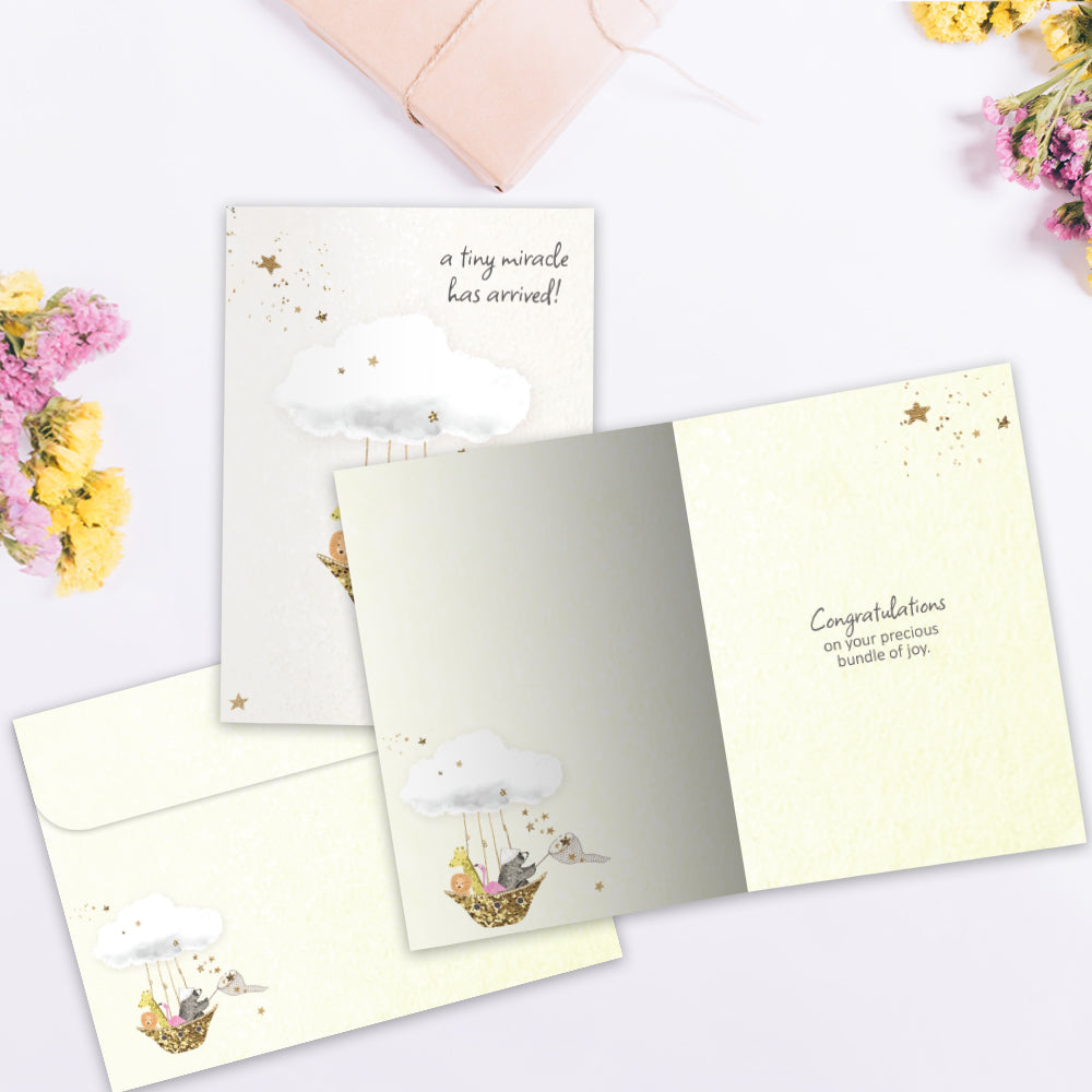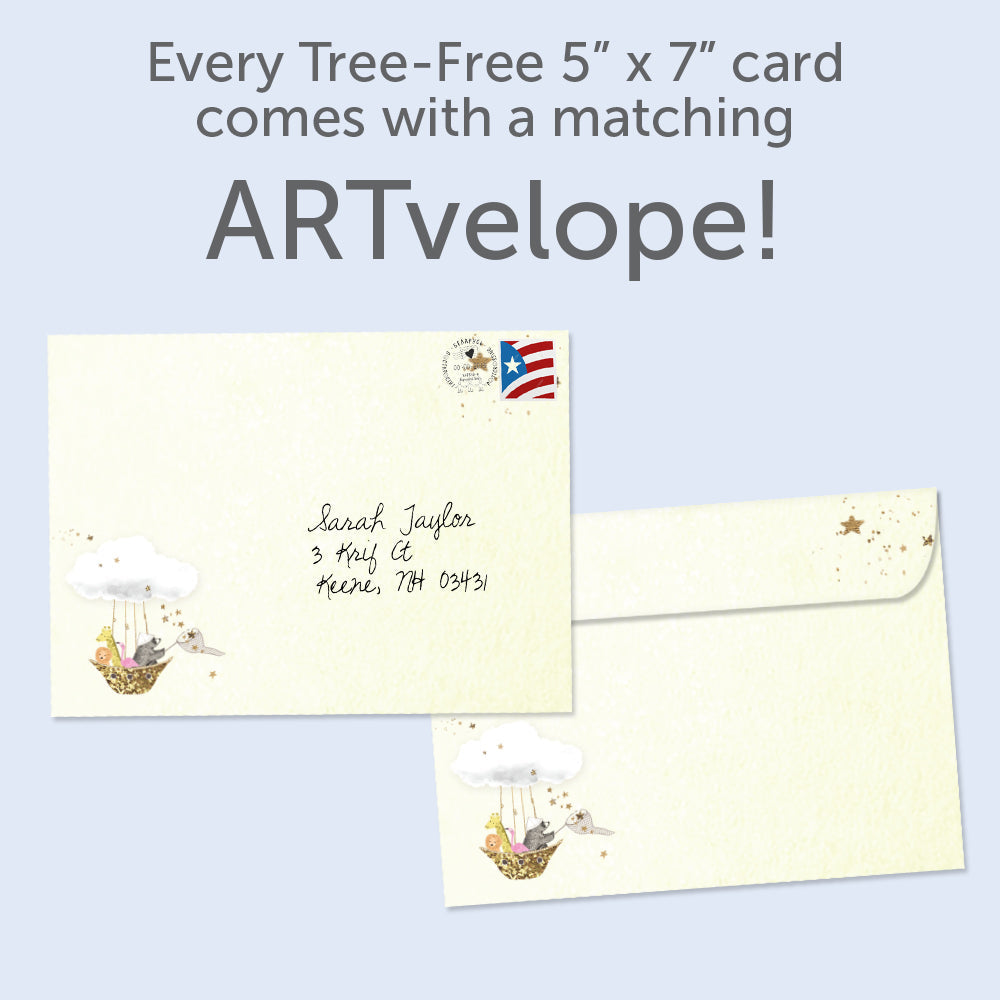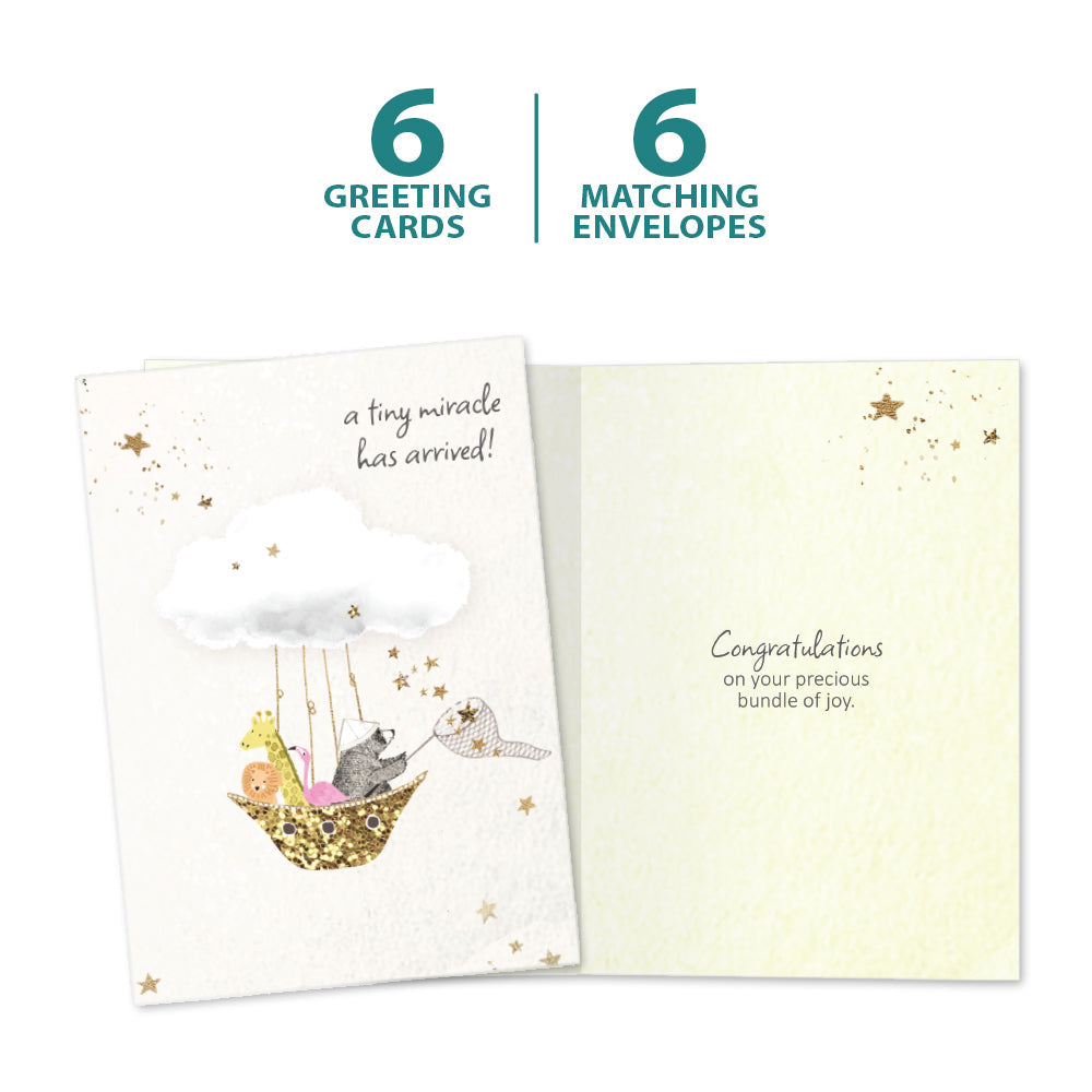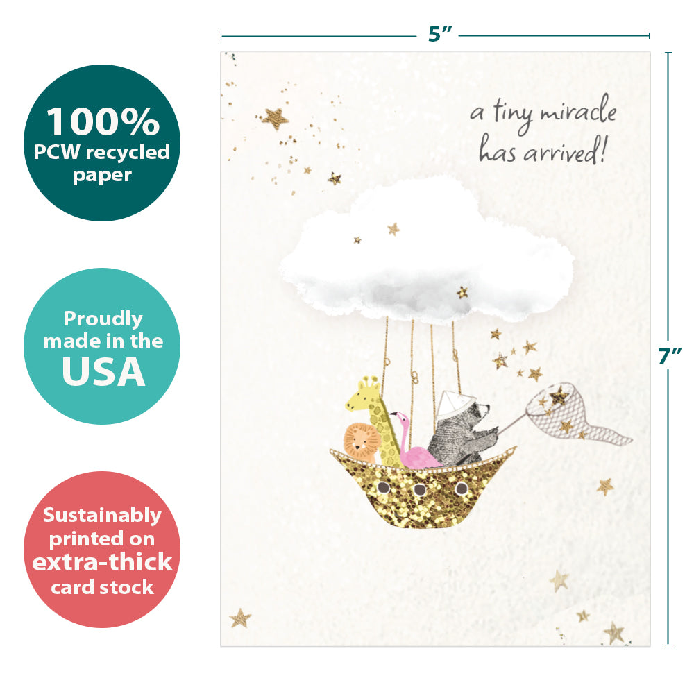 This New Baby card set shares the message "A tiny miracle has arrived!" on the cover, and on the inside reads "Congratulations on your precious bundle of joy". It features art by Hammond Gower Publications and includes six 5 x 7 greeting cards with matching ARTvelopes (all our 5 x 7 envelopes are designed to match the greeting card cover art). Printing powered by solar energy. 100% Post-consumer recycled. Proudly Made in the USA