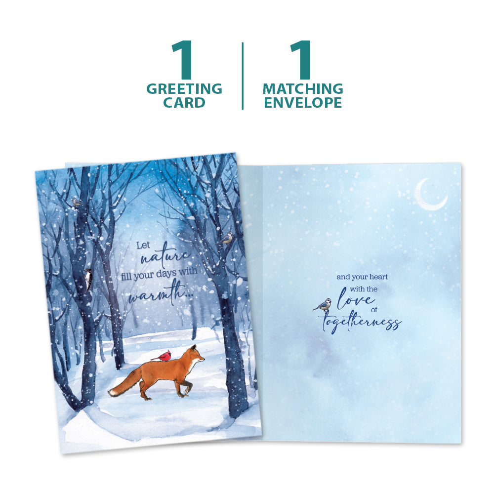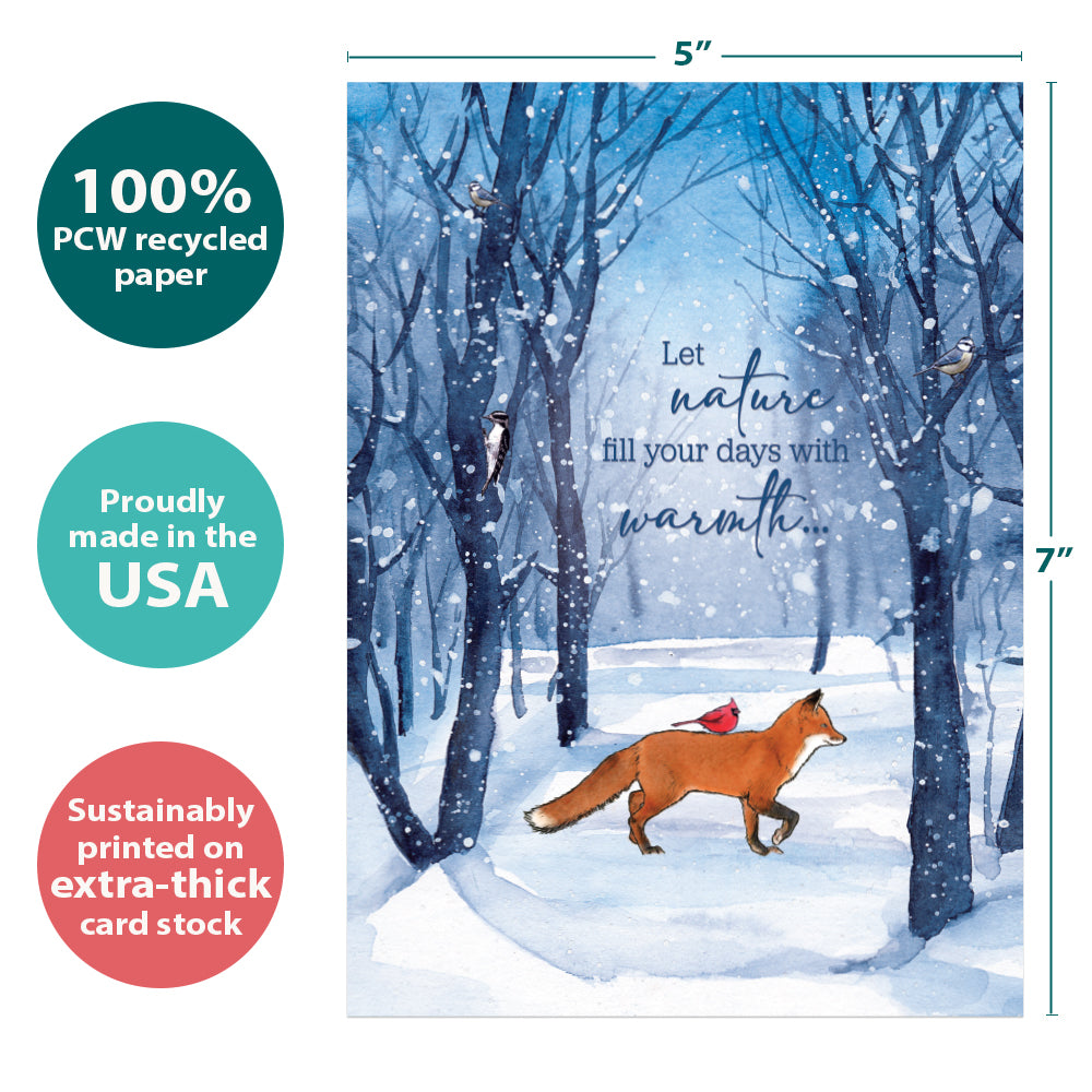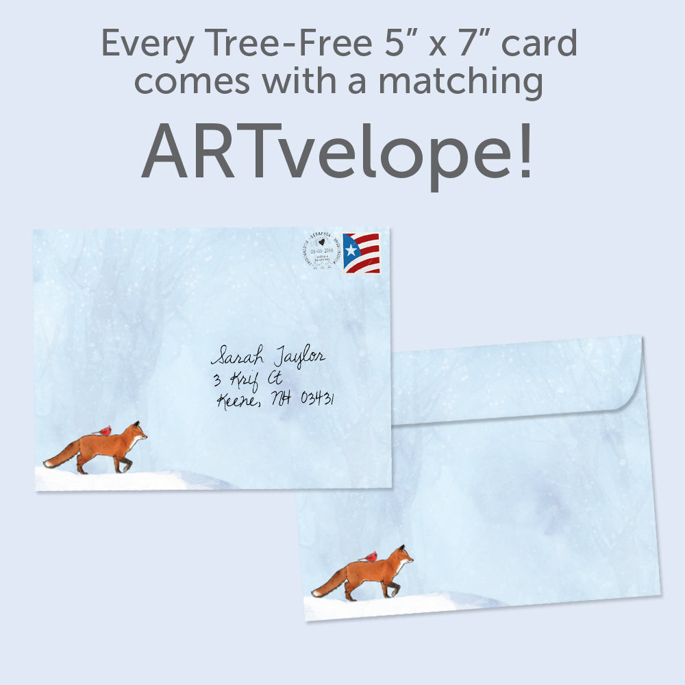This Solstice card set shares the message "Let nature fill your days with warmth..." on the cover, and on the inside reads "And your heart with the love of togetherness". It features art by Shawn Braley and includes one 5 x 7 greeting card with a matching ARTvelope (all our 5 x 7 envelopes are designed to match the greeting card cover art). Printing powered by solar energy. 100% Post-consumer recycled. Proudly Made in the USA