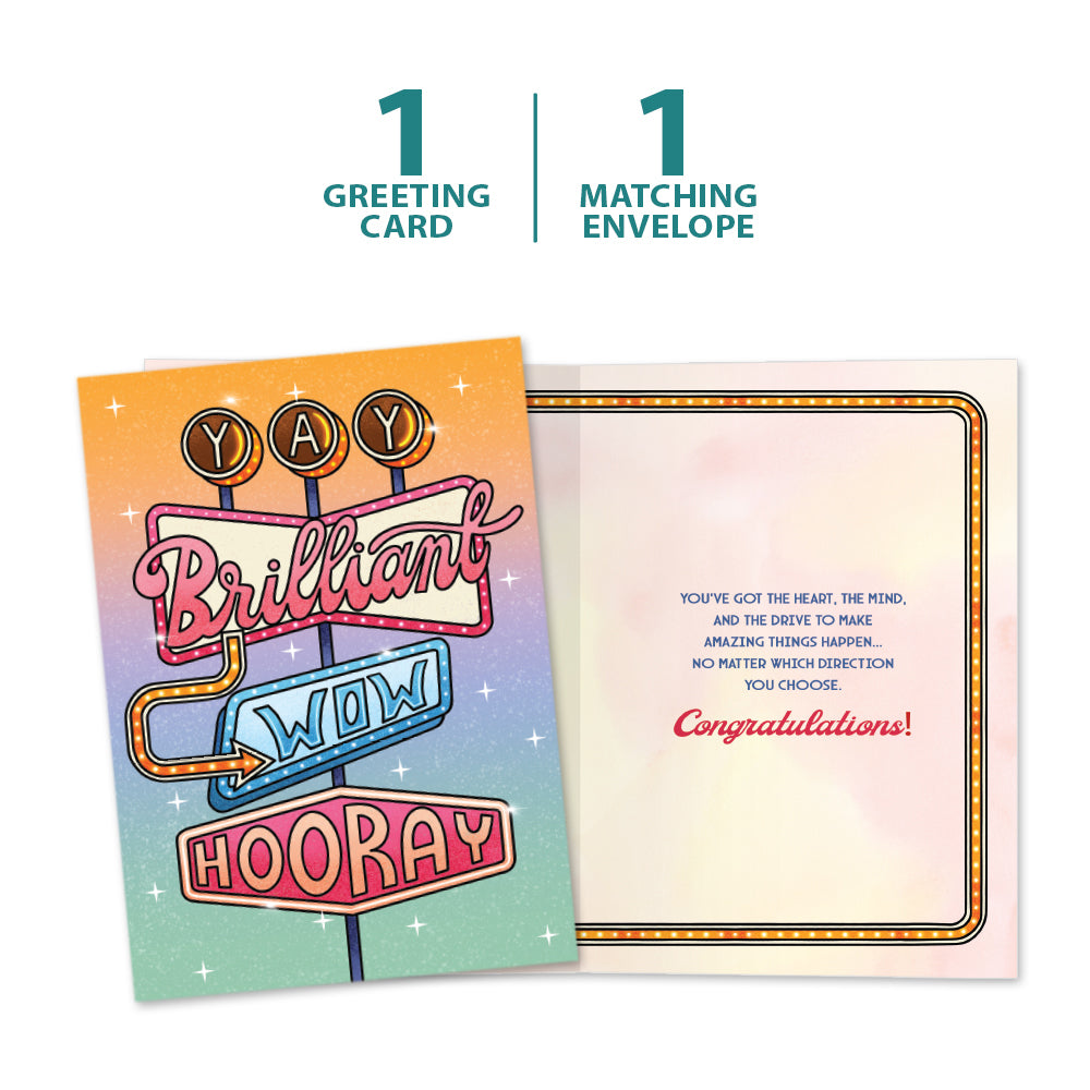 This Graduation card set shares the message "Yay! Brilliant! Wow! Hooray!" on the cover, and on the inside reads "You’ve got the heart, the mind, and the drive to make amazing things happen...no matter which direction you choose. Congratulations!". It features art by Anthea Designs and includes one 5 x 7 greeting card with a matching ARTvelope (all our 5 x 7 envelopes are designed to match the greeting card cover art). Printing powered by solar energy. 100% Post-consumer recycled. Proudly Made in the USA