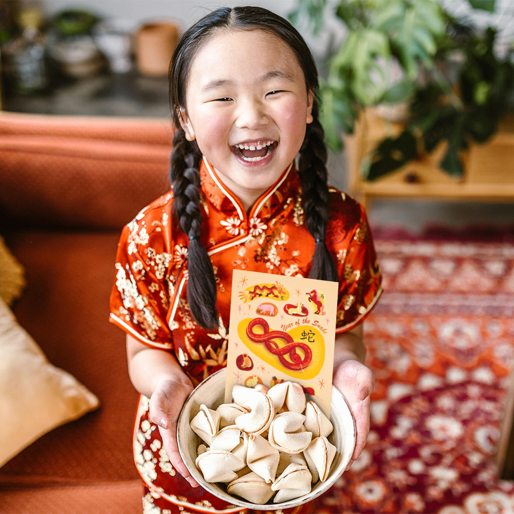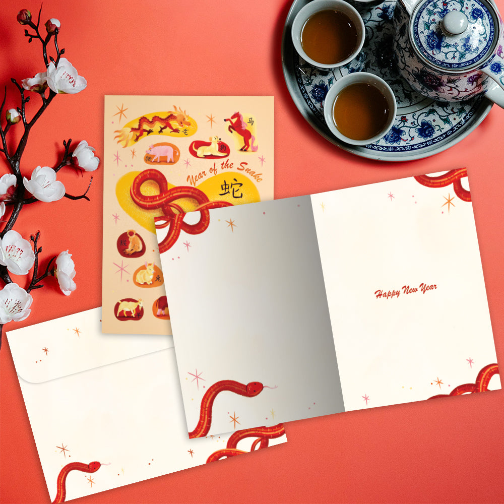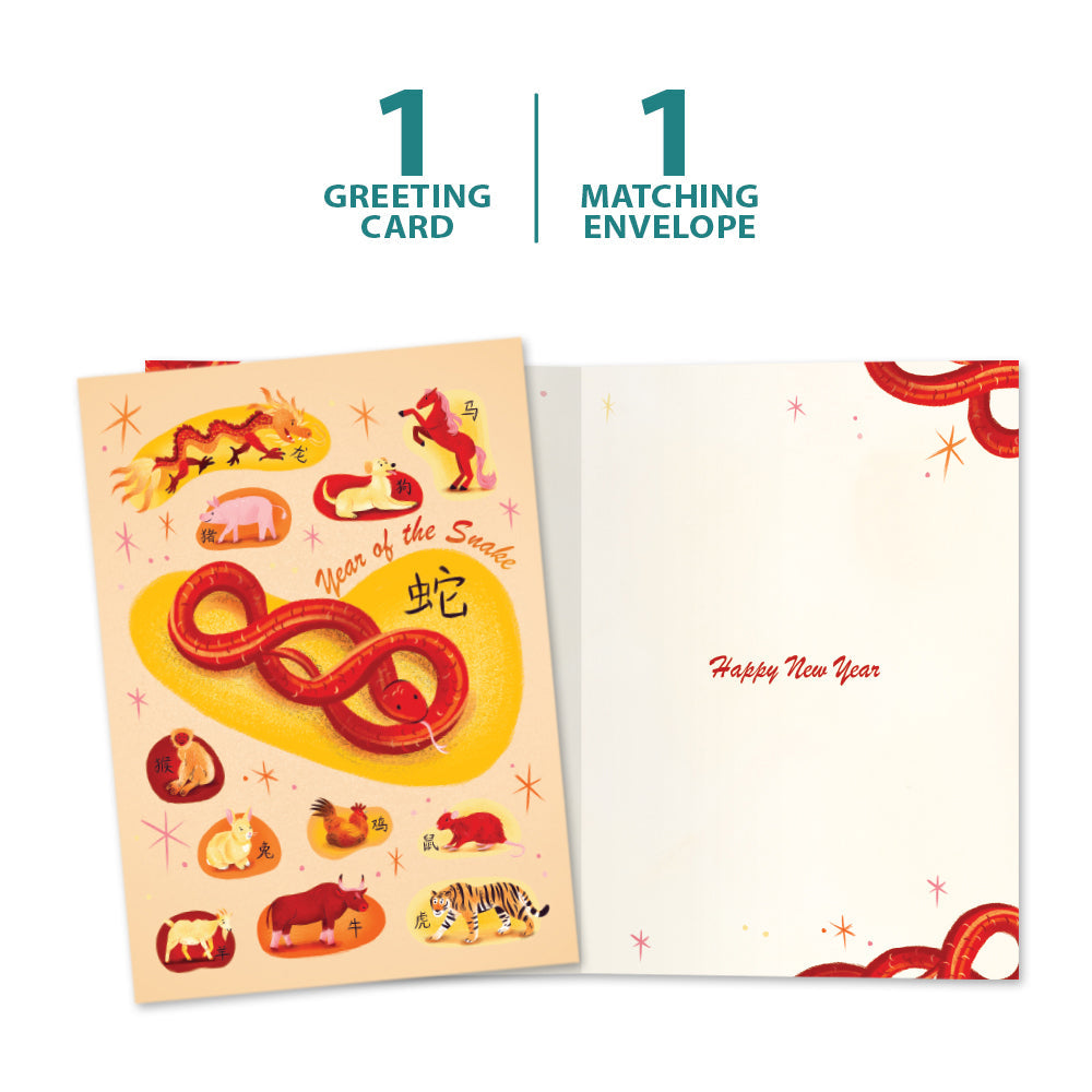 This Chinese New Year card set shares the message "Year of the snake" on the cover, and on the inside reads "Happy New Year". It features art by Brooke O'Neill and includes one 5 x 7 greeting card with a matching ARTvelope (all our 5 x 7 envelopes are designed to match the greeting card cover art). Printing powered by solar energy. 100% Post-consumer recycled. Proudly Made in the USA