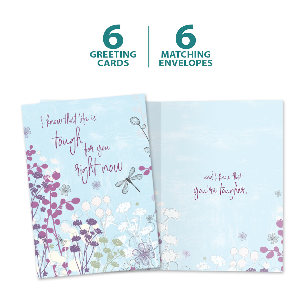 This 5 x 7 Support and Encouragement greeting card reads "I know that life is tough for you right now" on the cover, and on the inside shares the message "And I know that you're tougher". It features art by Rachael Taylor, includes a fully printed matching ARTvelope, and is made from 100% post-consumer recycled material. Our printing processes are powered by solar energy and are proudly made in the USA. This is for a retail ready 6 Pack